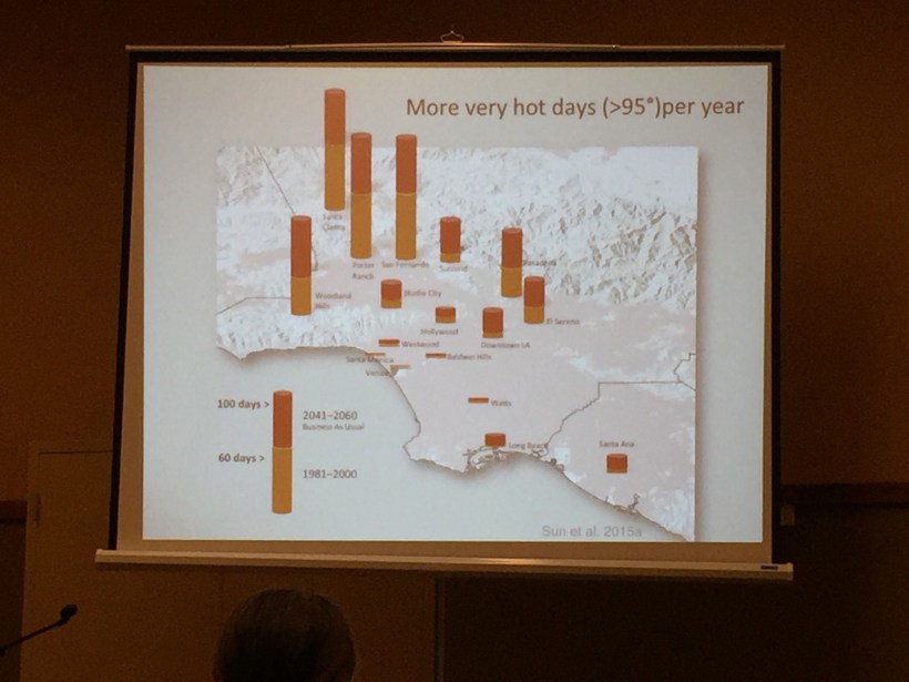 Alex Hall from UCLA summarized recent studies that his team has done to identify the impacts of climate change on specific areas of Southern California. This includes detailed heat maps of our region (below).