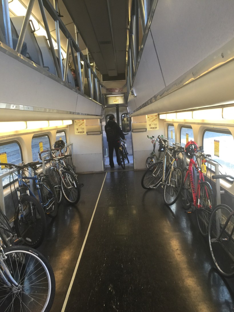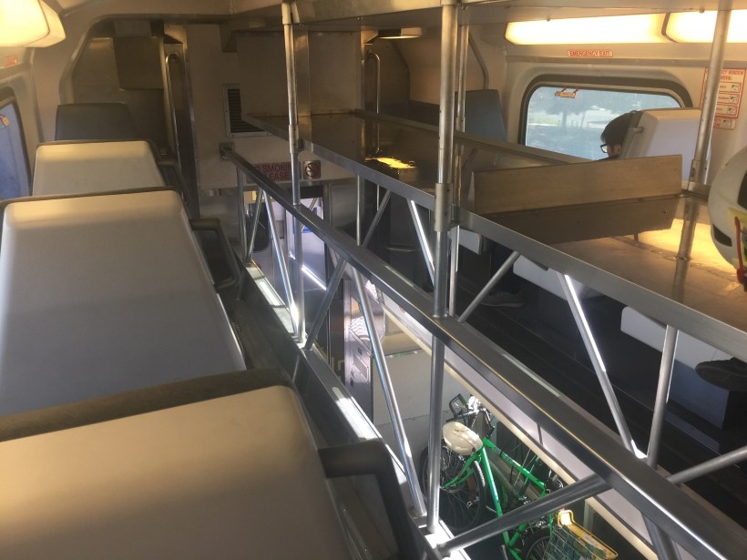 I had been hearing about the bike cars on Caltrain for years but this was my first chance to use them. Initially, they just removed a few seats to make room for bikes. They eventually dedicated a whole car to bikes, then two cars and now have custom two-level cars for bikes and their owners. You can see the seating area above the bike storage space in the above photo (there are about 20 seats on the upper level and eight on the bike level).