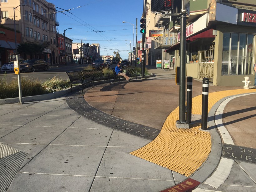 Nice seating in this generous curb bulbout at the foot of Van Ness at Cesar Chavez.