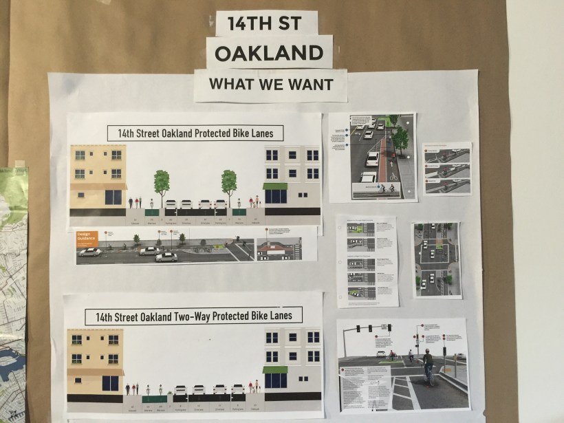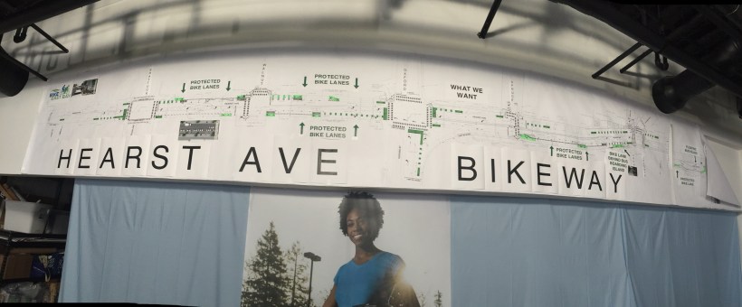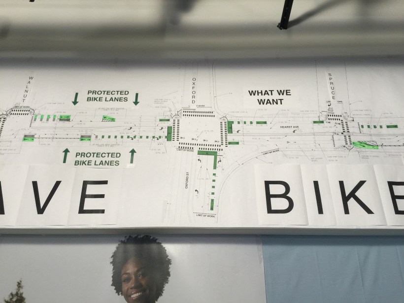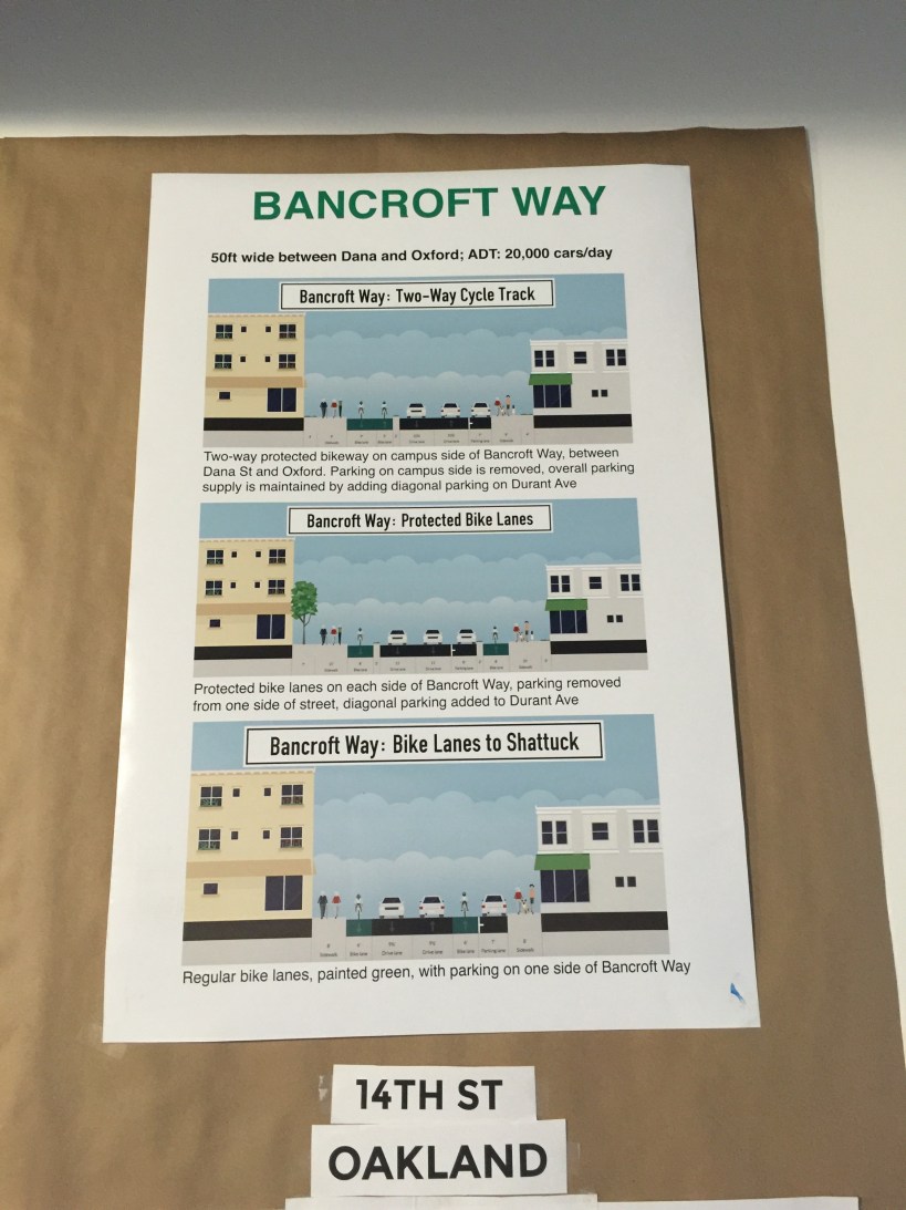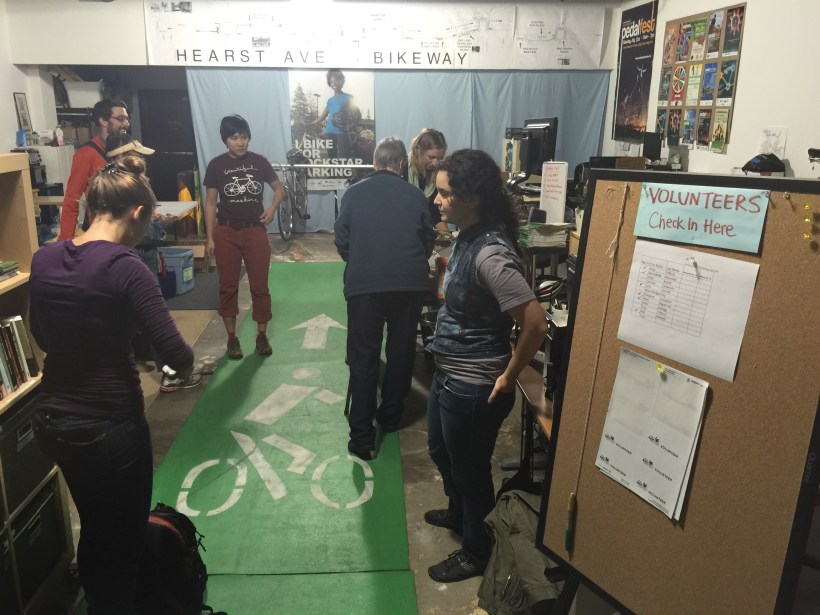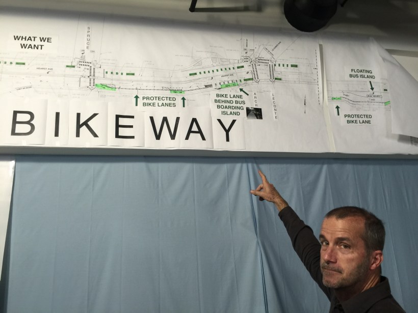 Another protected bike lane campaign that the group has underway focuses on Hearst Ave. For this project they obtained enlarged copies of the city’s concept illustrations and added overlays of the improvements they want incorporated (above). These are used in community meetings to help community members visualize the benefits of their recommendations. Like the Telegraph Ave. project, a pop-up, temporary installation of the recommended features was also created for Hearst.